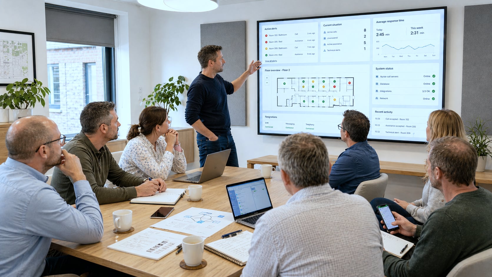 Les systèmes d’appel infirmier historiques ont presque tous été conçus pour l’hôpital. Leurs fonctionnalités, leur ergonomie, leur modèle économique répondent à la logique d’un service aigu : rotation rapide des patients, équipes spécialisées, infrastructure lourde, maintenance centralisée. Transposés en maison de repos, ces systèmes deviennent souvent surdimensionnés, rigides et coûteux à faire évoluer.